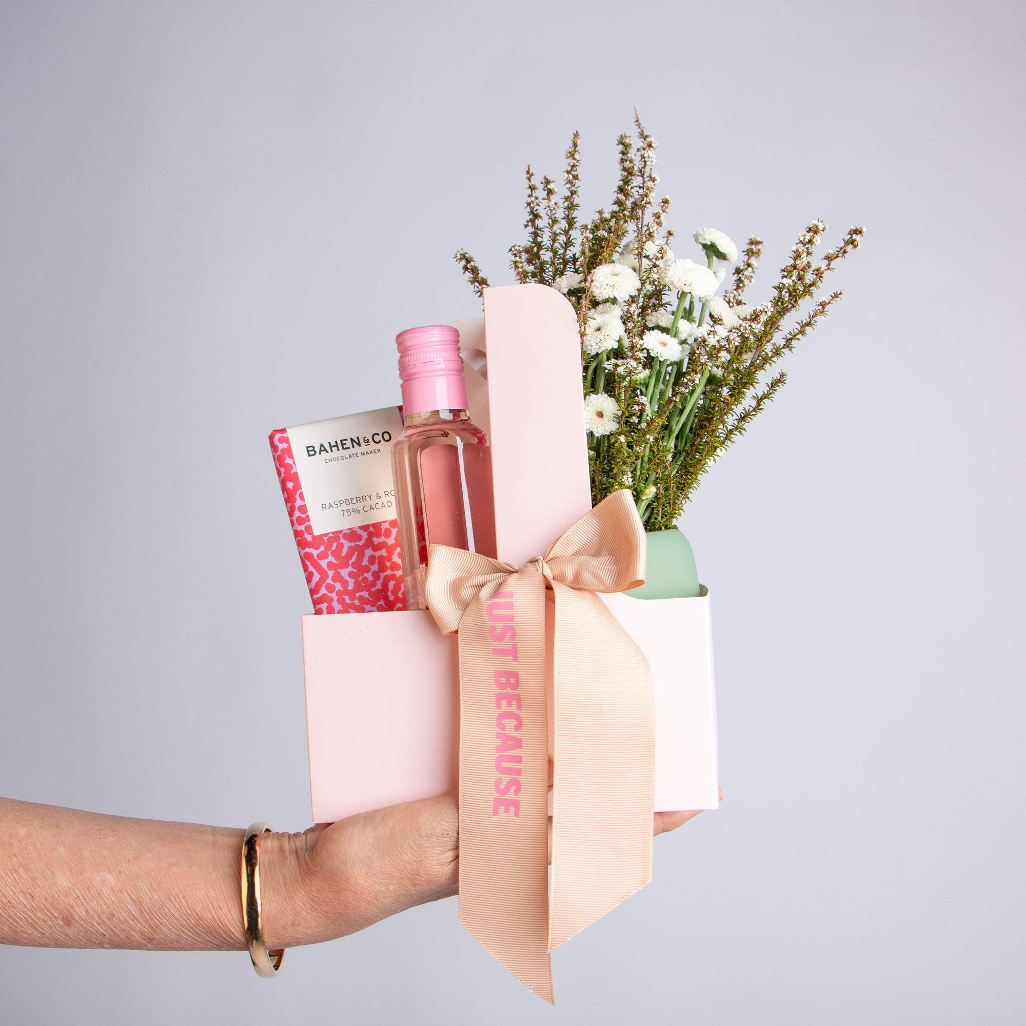 This petite hamper includes a vase of fresh seasonal blooms, a premium Bahen & Co chocolate bar, and your choice of wine (white, red or rosé) selected via the dropdown menu.