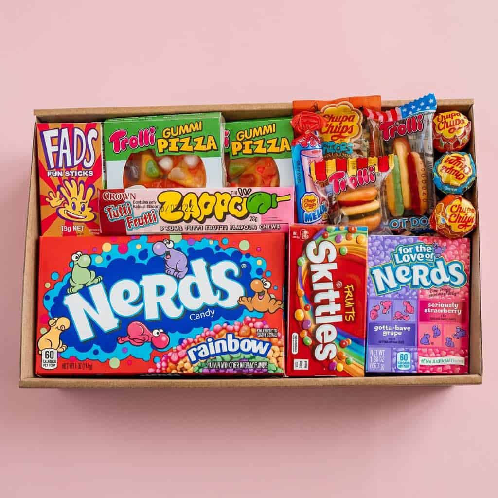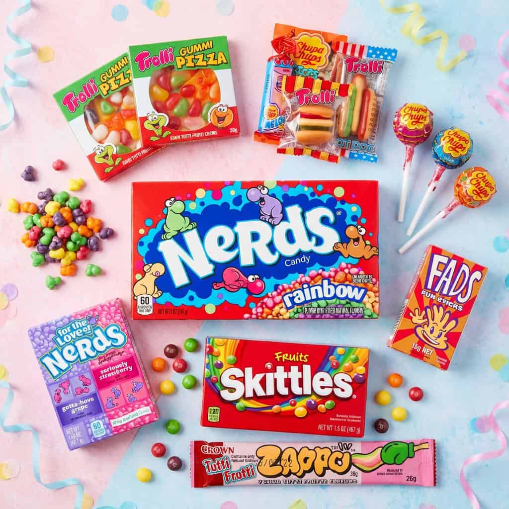 Indulge your sweet tooth with the Small Sugar Rush dessert box. Packed with a variety of colourful and delicious treats, this box is sure to satisfy your cravings. From rainbow nerds to skittles, strawberry and grape nerds to zappos, and even trolli pizzas, chupa chups, fads, and melody lollipops, there’s something for everyone in this sweet assortment.