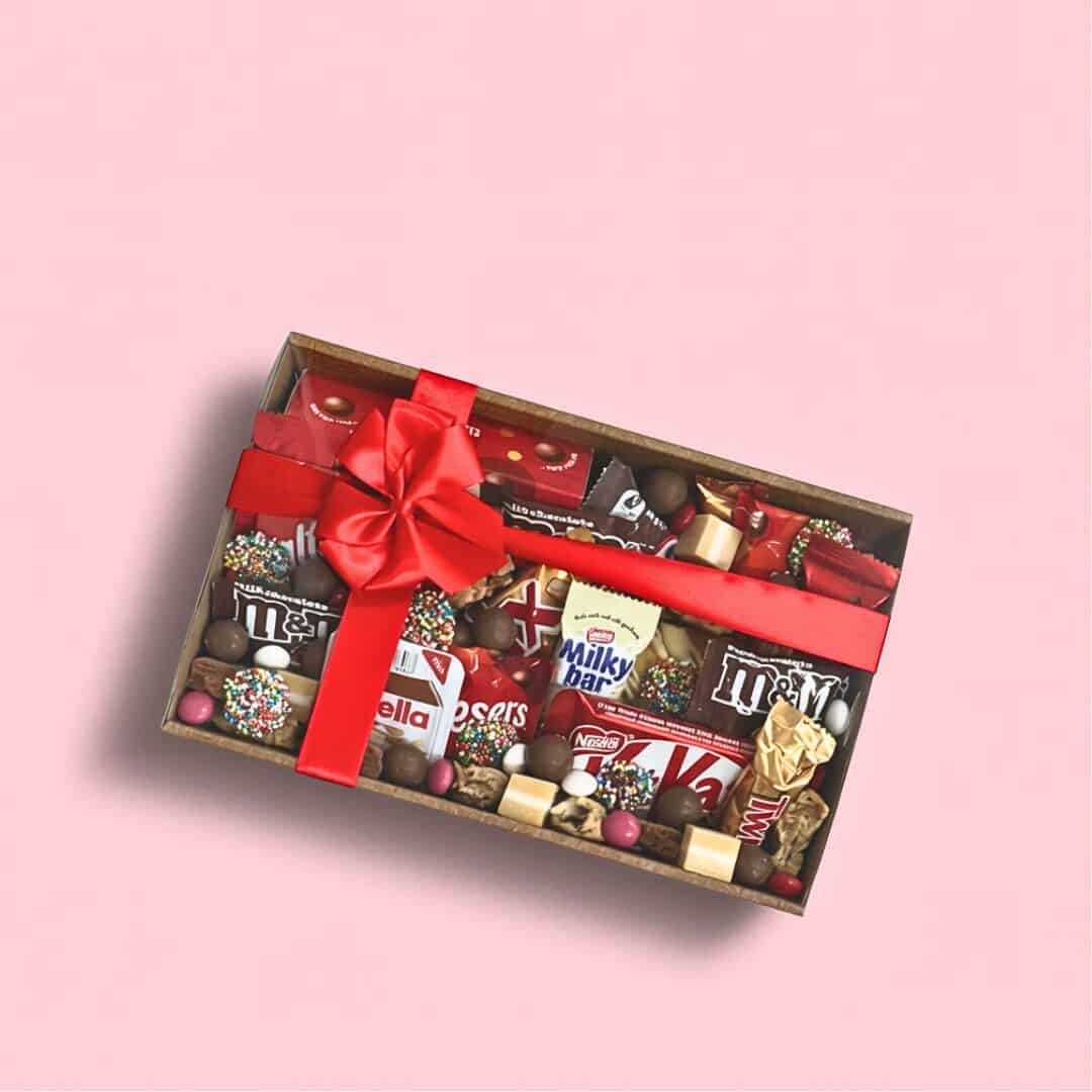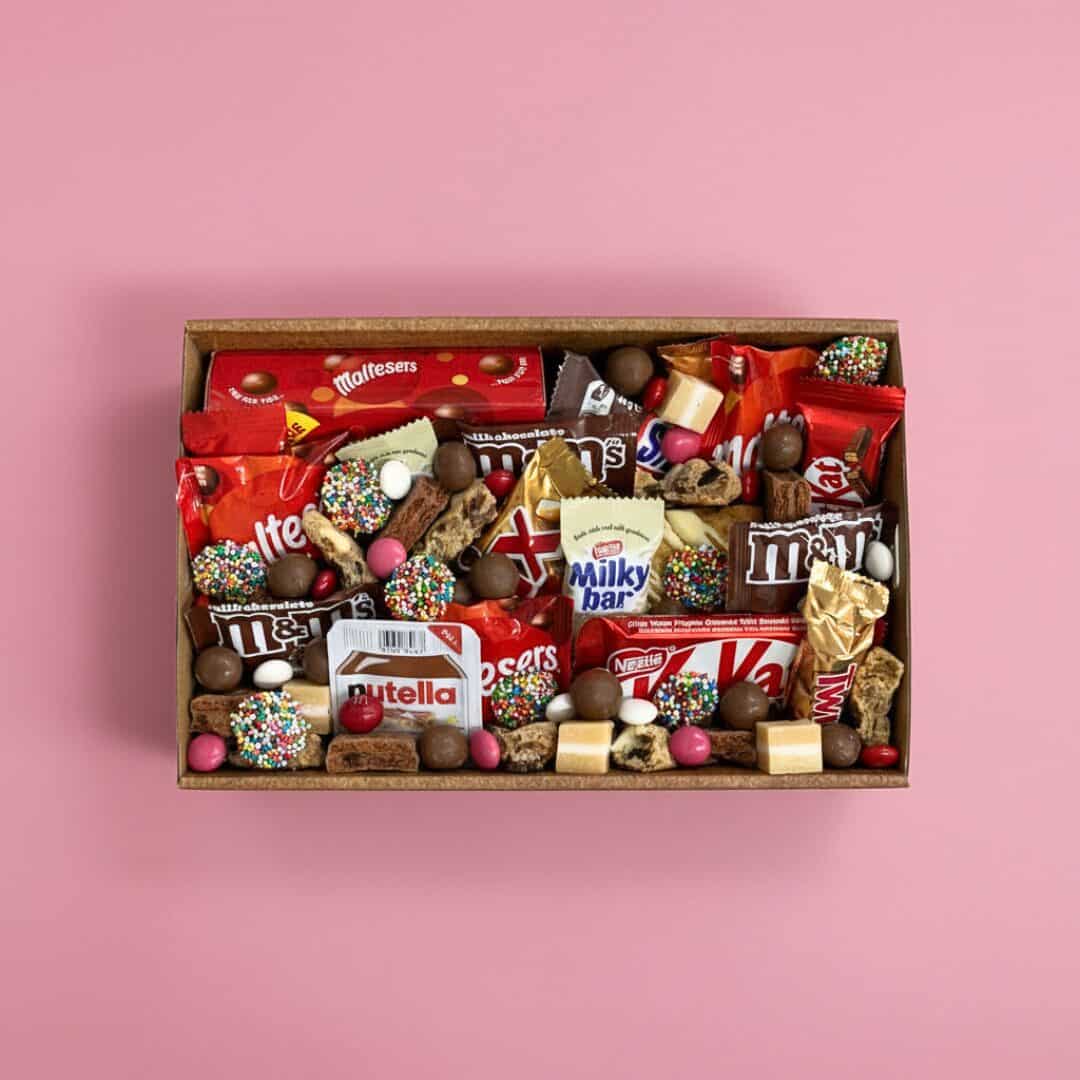 A dreamy Valentines Day dessert box packed with all the chocolate favourites and a sprinkle of fun. Loaded with classic chocolate bars, Nutella, Maltesers, M and Ms, plus cookie and brownie bites and rainbow sprinkle treats, it is the ultimate sweet surprise for your sweetheart.