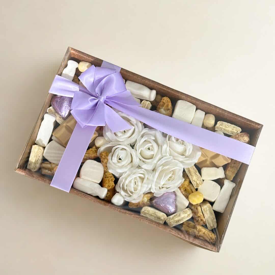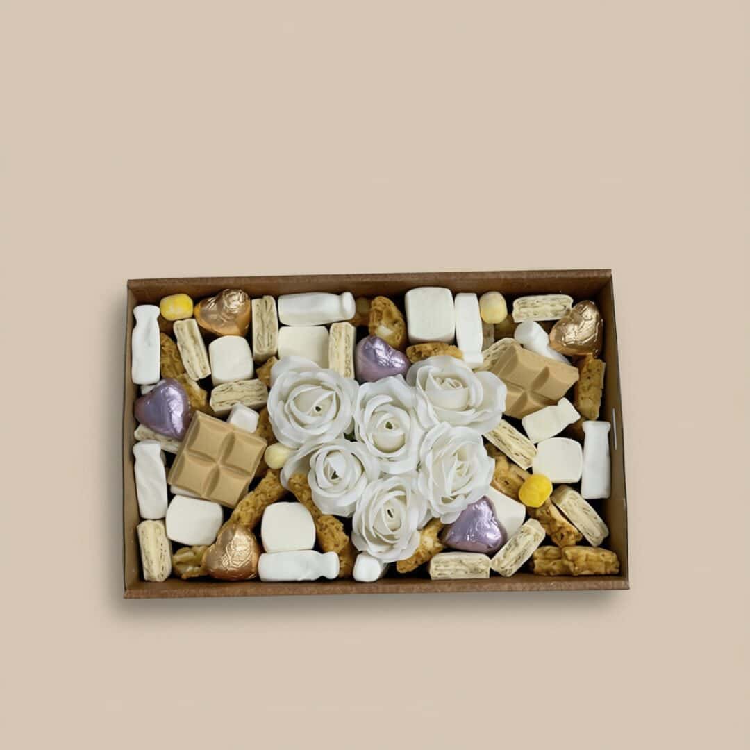 A romantic Valentine’s Day dessert box packed with dreamy sweet treats and finished with a stunning white rose centrepiece. Filled with chocolate hearts, caramel chocolate blocks, fluffy marshmallows, Tim tams, and golden cookie style bites for the ultimate shareable gift.