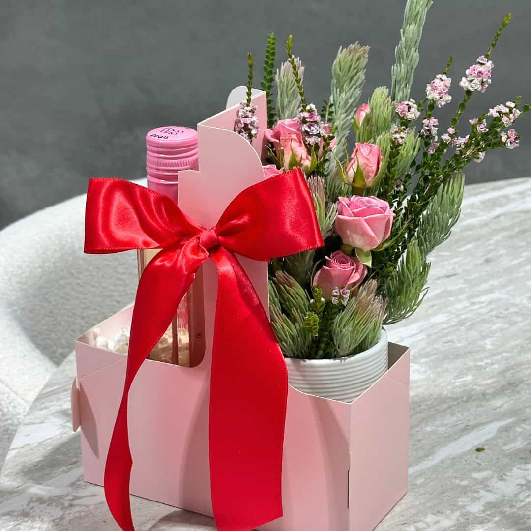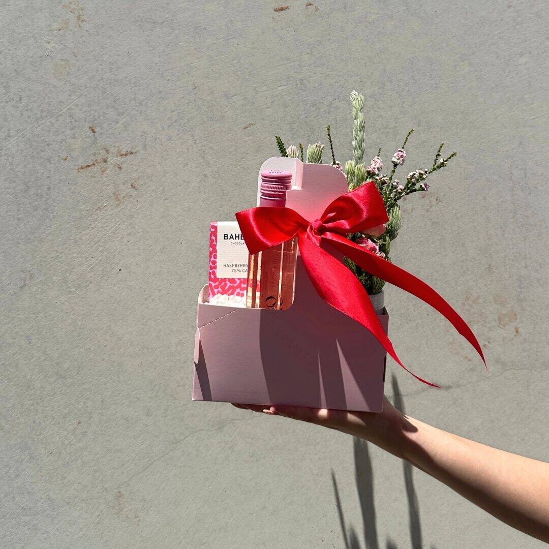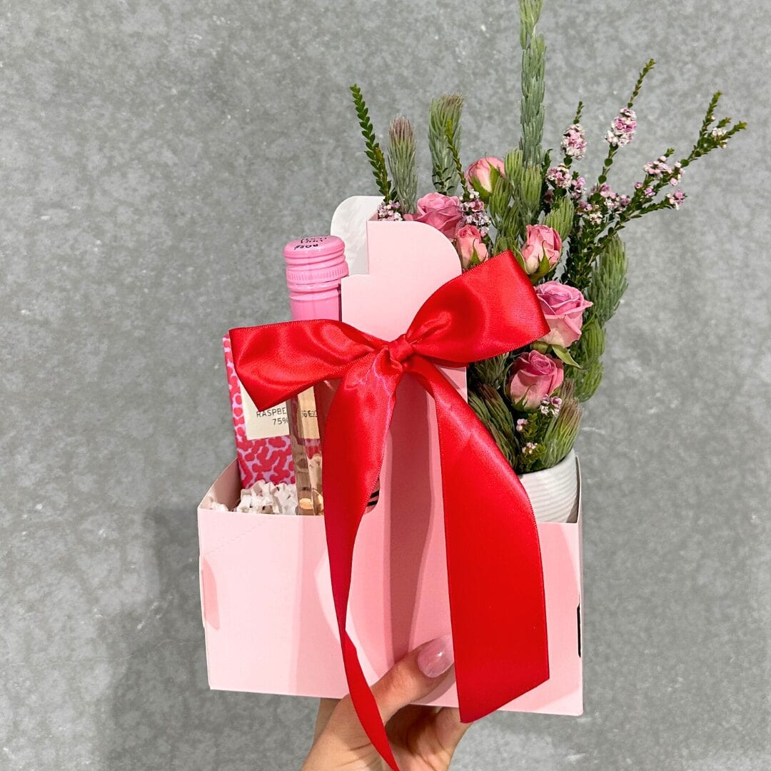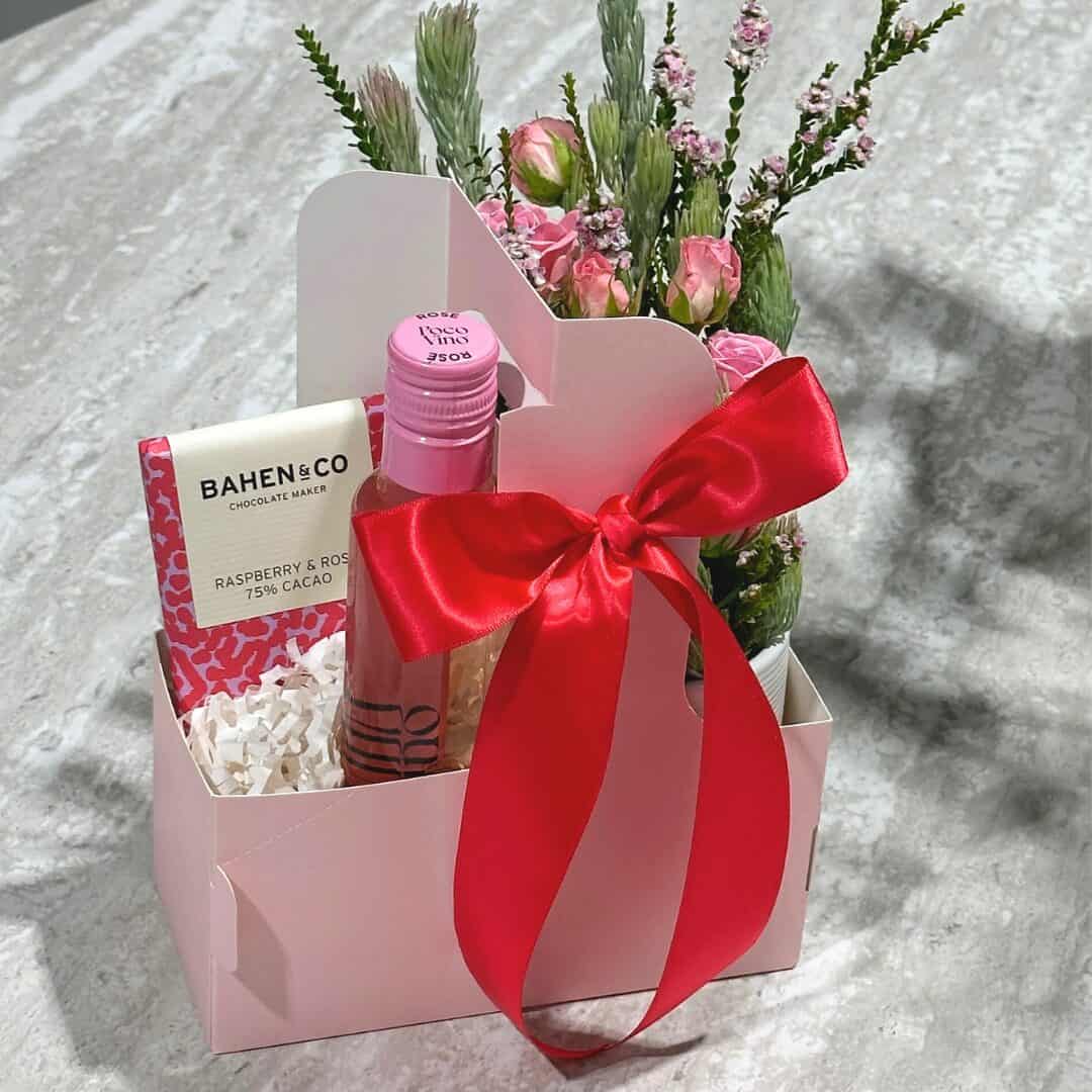 A sweet little Valentine’s Day gift caddy featuring blush roses in a white pot, a mini bottle of rosé vino, and a Bahen and Co Raspberry and Rose chocolate bar, finished with a luxe red satin bow. Romantic, pretty, and ready to gift straight away.